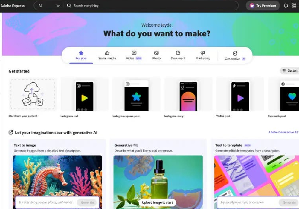 Adobe Express is a lightweight yet powerful tool from Adobe that simplifies graphic design through templates, AI-powered editing, and one-click branding tools. It enables users to create posters, stories, logos, thumbnails, ads, and more—all optimized for social platforms.