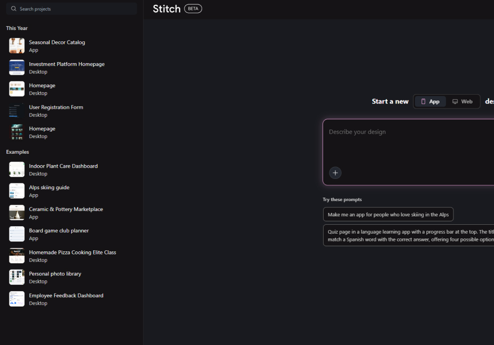 Stitch AI (by Google) is an experimental generative design tool that transforms plain-language descriptions or hand-drawn sketches into responsive UI designs, along with front-end code. With Stitch, you can quickly prototype interfaces for mobile or web apps, iterate design variants, refine themes, and export to Figma or clean HTML/CSS — making the handoff between design and development seamless.